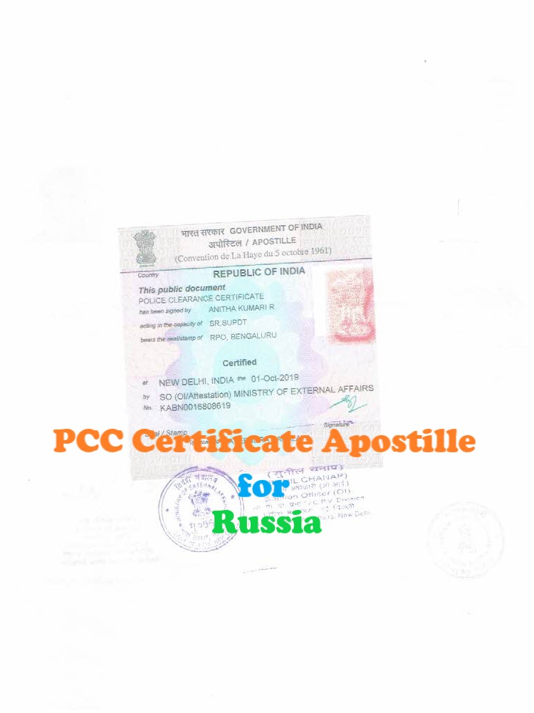 On the other hand, the Police Clearance Certificate /PCC Apostille for Russia will be completed from Ministry of External Affairs /MEA, Government of India directly, when the PCC /No Criminal Record Certificate has issued from Regional Passport Office /RPO, India or issued from Indian Diplomatic Mission in Russia.