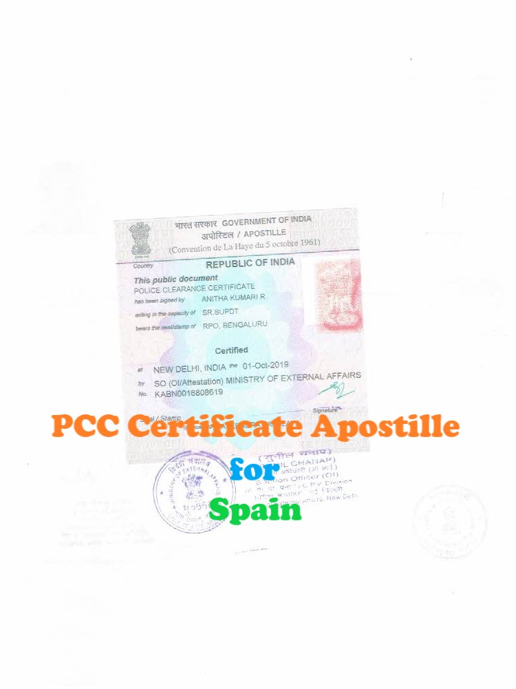 On the other hand, the Police Clearance Certificate /PCC Apostille for Spain will be completed from Ministry of External Affairs /MEA, Government of India directly, when the PCC /No Criminal Record Certificate has issued from Regional Passport Office /RPO, India or issued from Indian Diplomatic Mission in Spain.