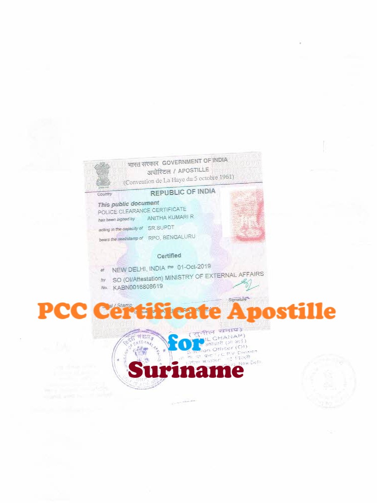 On the other hand, the Police Clearance Certificate /PCC Apostille for Suriname will be completed from Ministry of External Affairs /MEA, Government of India directly, when the PCC /No Criminal Record Certificate has issued from Regional Passport Office /RPO, India or issued from Indian Diplomatic Mission in Suriname.