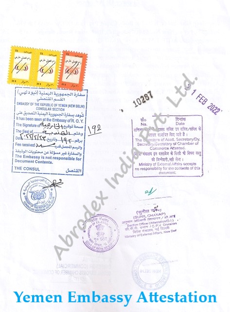 Abrodex India Private Limited is one of the authorized and premier Service providers for School Leaving Certificate Attestation from Yemen Embassy in India. We have more than 10 years of Experience in the field of Certificate Attestation, Authentication, Apostille, Embassy Legalization and Visa Stamping Services. Contact us anytime and get your School Leaving Certificate Attestation from Yemen Embassy done with a hassle-free and pocket-friendly manner.